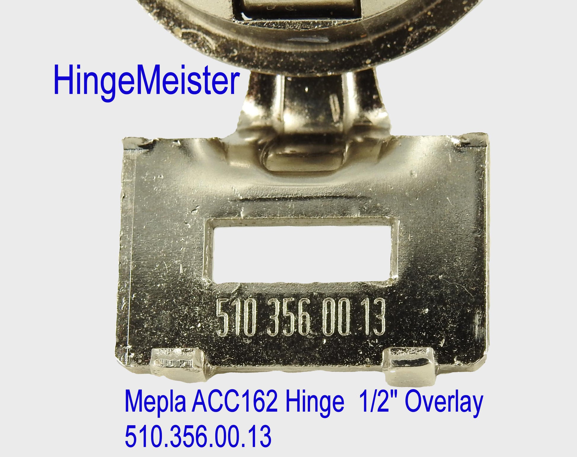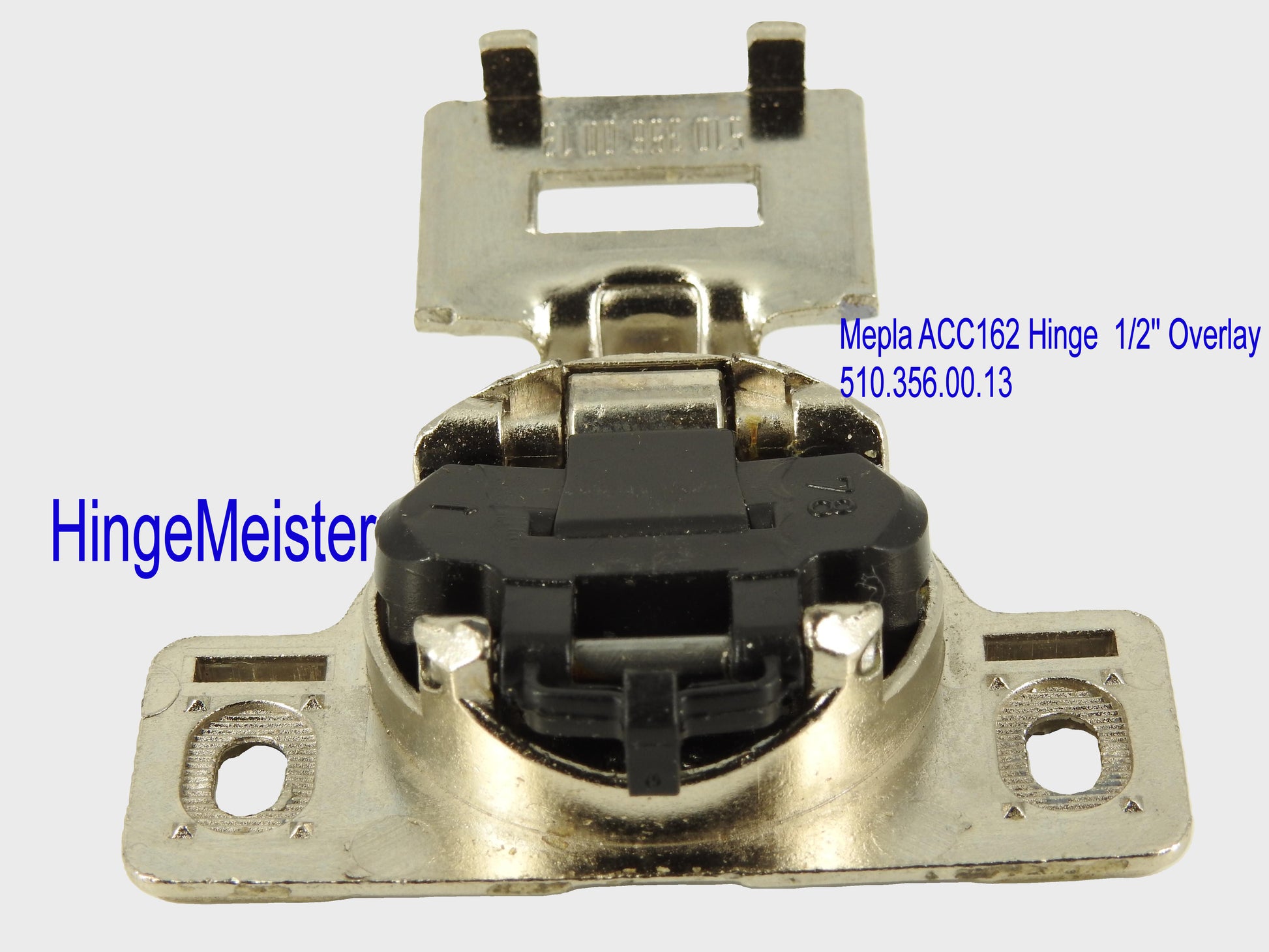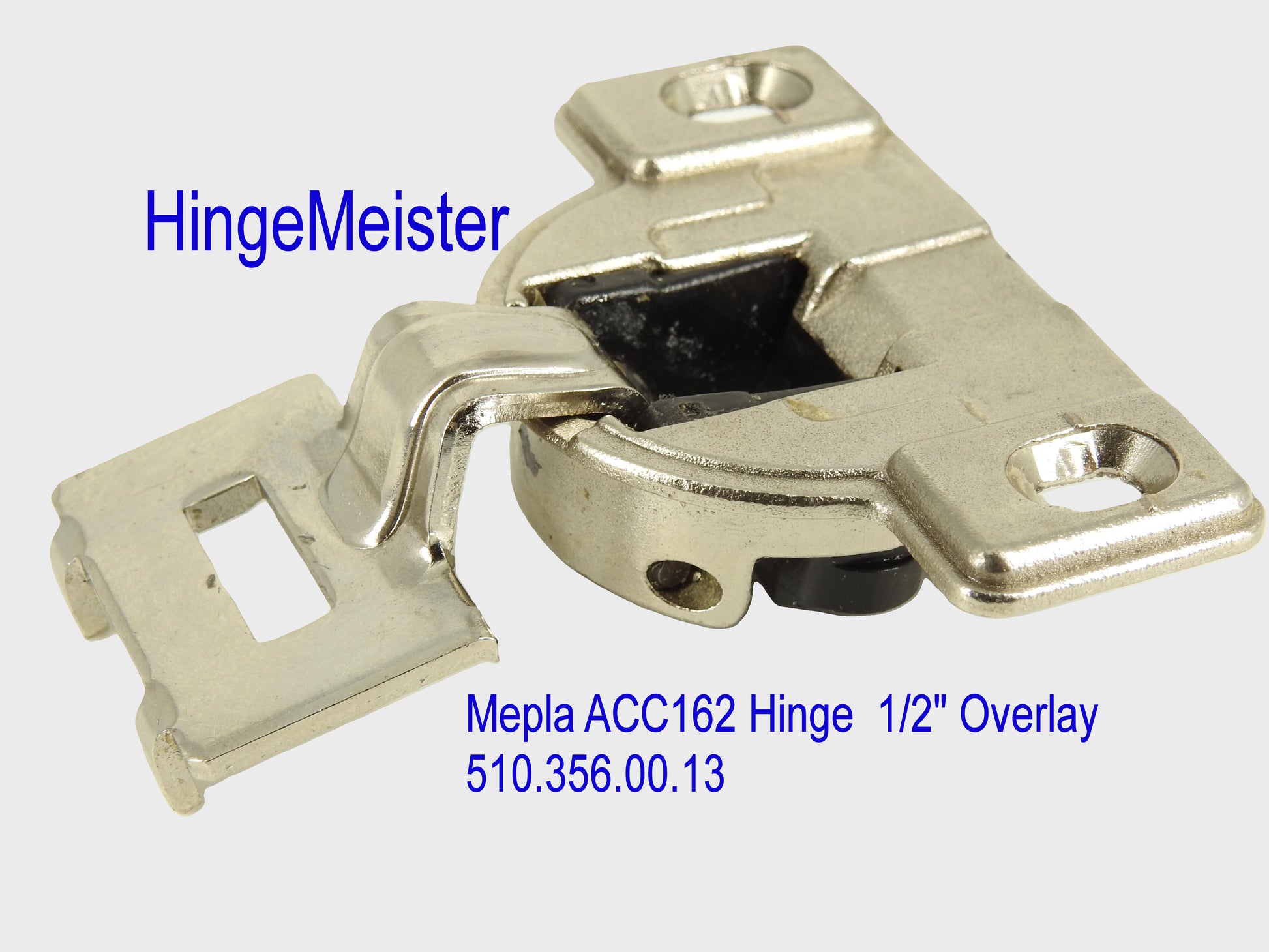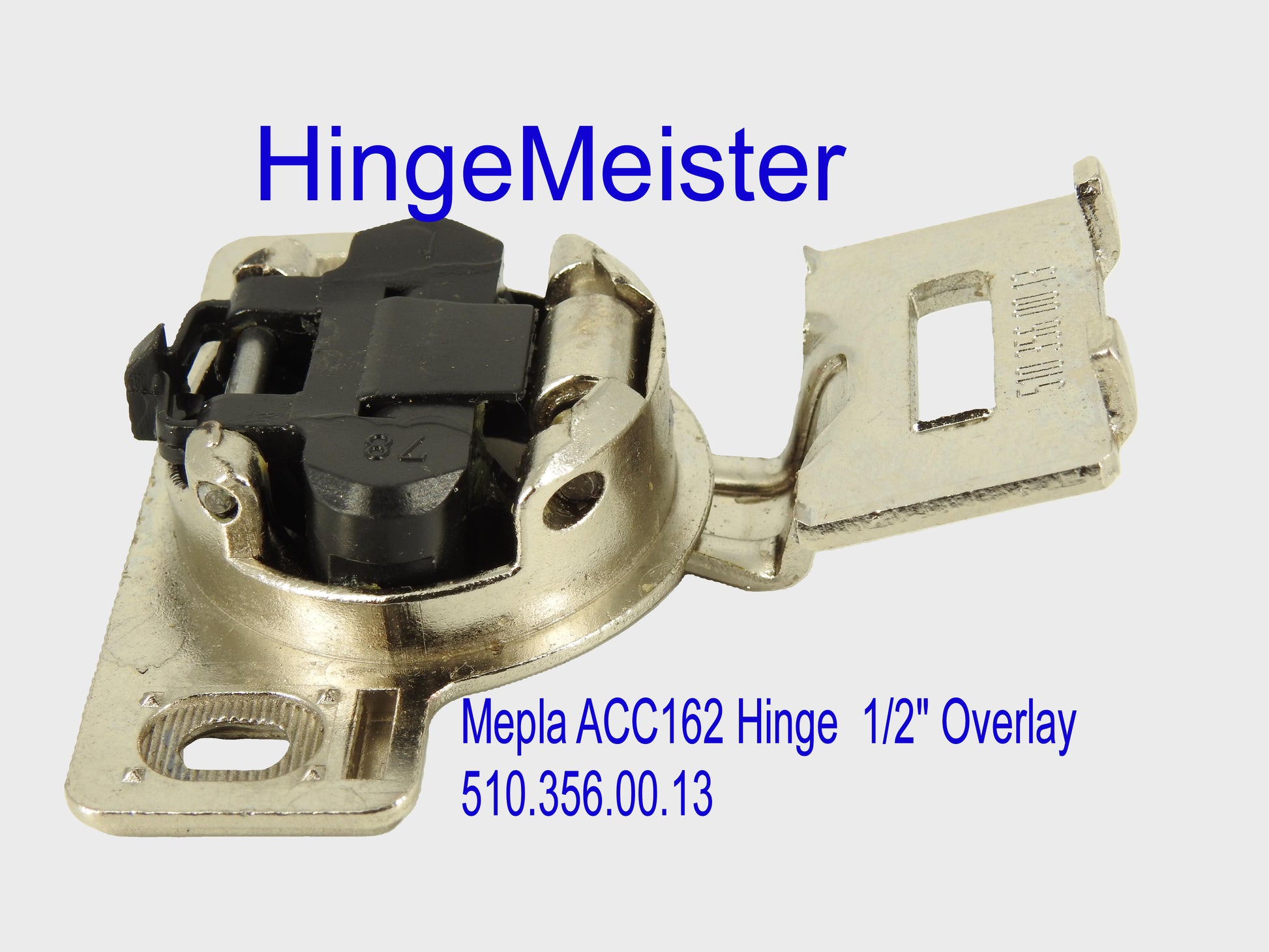 Mepla Hinge ACC 162 - 1/2" Overlay Refurbished Mepla hinge. This hinge has been discontinued, but it's available here until they are gone. Sold in packs of one hinge. I'm a cabinet maker and I've used these and similar hinges for over 40 years. Please ask if you have any questions about your application.